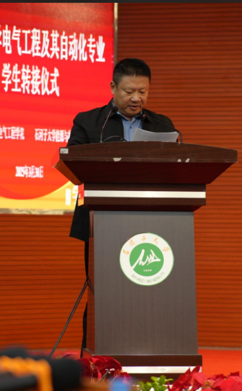 转接仪式上,两院领导分别致辞,机械电气工程学院党委书记汤骅强调,“电气工程及其自动化专业作为学院的优势学科,累计培养的千余名毕业生中,已有超过半人成长为新疆能源电力领域的技术骨干。此次专业调整不是简单的院系迁移,而是学科优势的战略重组。”能源与材料学院党委副书记、院长张立新表示,“电气工程及其自动化与新能源科学与工程、储能科学与工程相得益彰,构建了完整的‘能电储’一体化专业人才培养体系,为能源动力专业硕士的培养、为能源动力专业博士授权点的申报奠定了坚实基础。也为培养复合型人才、突破能源领域关键技术提供了全新平台。”双方学院领导对电气工程及其自动化专业学生均给予了厚望,希望学生以工程师的严谨和创新者的锐气,在能源领域踔厉奋发,成为国家栋梁人才。