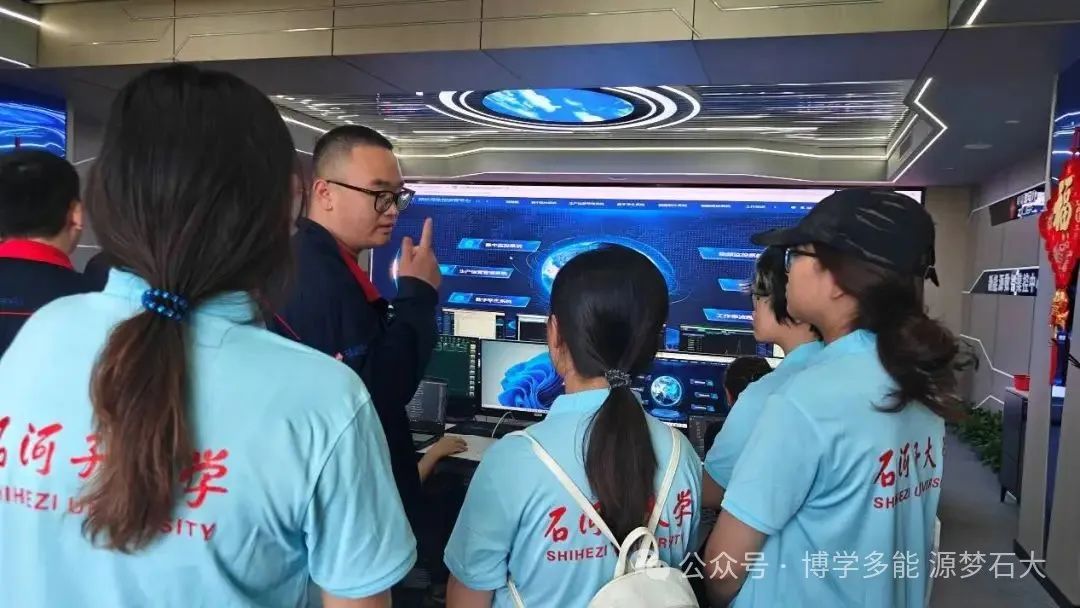 在集控中心,天富能源的工作人员热情接待团队成员,并以生动详实的讲解,展示了新能源集控平台的先进技术。从无人机态势监控系统的实时设备巡检,到数字孪生技术对能源场景的精准复刻;从驾驶舱式可视化大屏的全域数据呈现,到集中监控与生产运营管理系统的高效协同调度,一系列前沿科技的应用,让同学们直观感受到现代能源产业的智能化魅力。