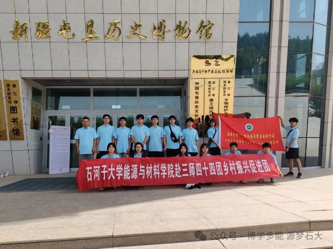 活动尾声,全体成员在新疆屯垦历史博物馆庄重的门楣前肃立合影。“新疆屯垦历史博物馆”的鎏金匾额被映照得格外耀眼,其沉淀的两千余年屯垦沧桑仿佛触手可及。与之交相辉映的,是队员们手中紧握的“石河子大学三下乡服务团”鲜红旗帜,那抹跃动的红,如同青春热血在历史长河中注入的澎湃活力。
