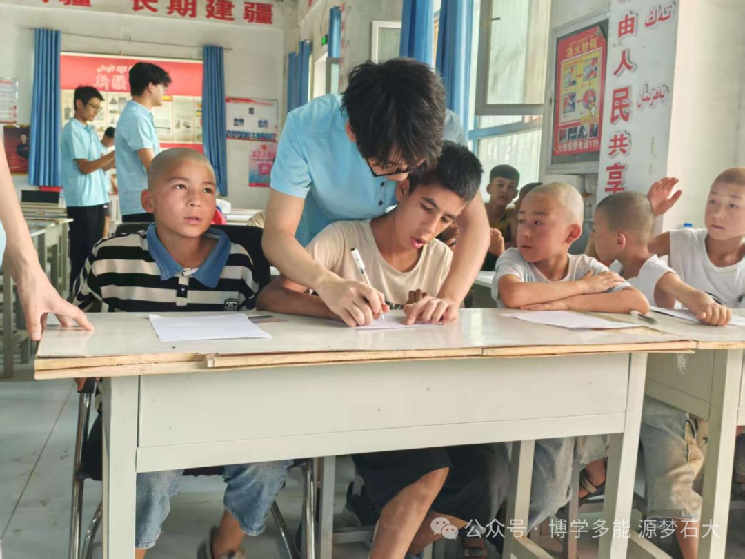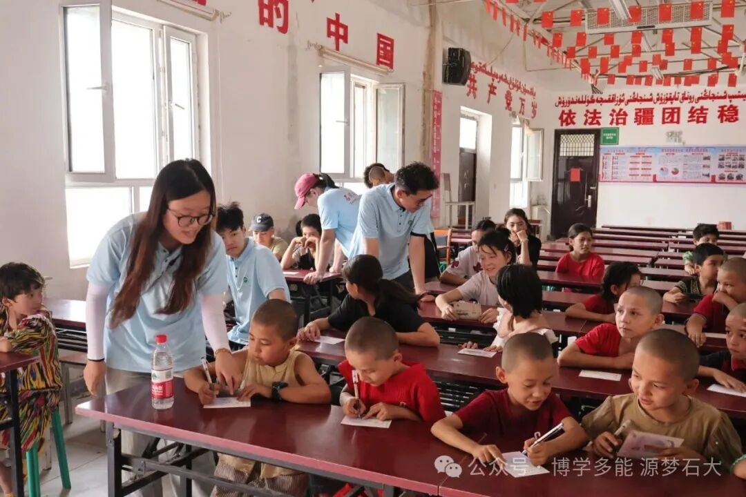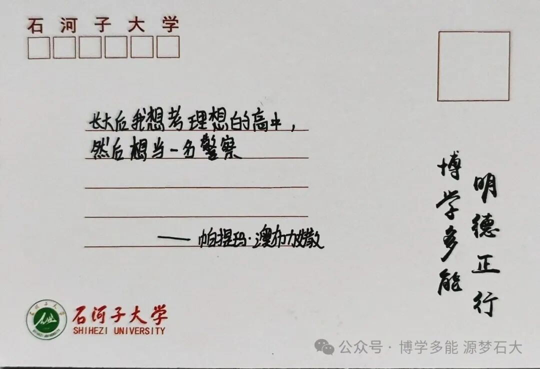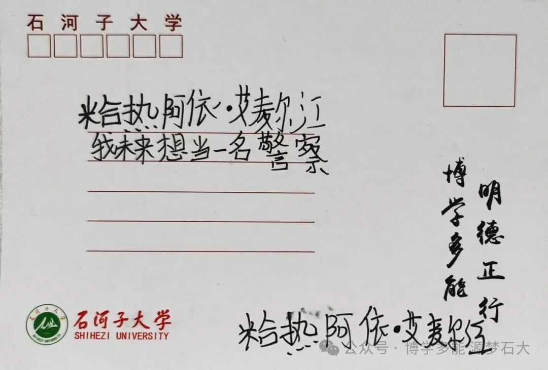 当日,阳光洒满巴扎村,实践团成员组织小朋友们围坐在一起,为他们分发了印有石河子大学校训“博学多能,明德正行”的明信片。“小朋友们,你们长大后想成为什么呀?是成为医生、老师、消防员还是军人呢?都可以把它写在明信片上,这是你们对未来的期待哦。”实践团成员温柔地引导着孩子们。