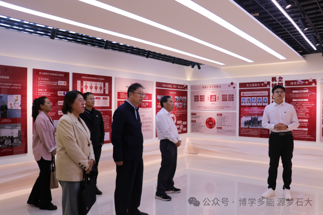 (图为两校参会人员参观中国石油大学(北京)克拉玛依校区工学院机械与过程系党支部党建展示区,展板呈现支部组织架构、特色活动及荣誉成果)