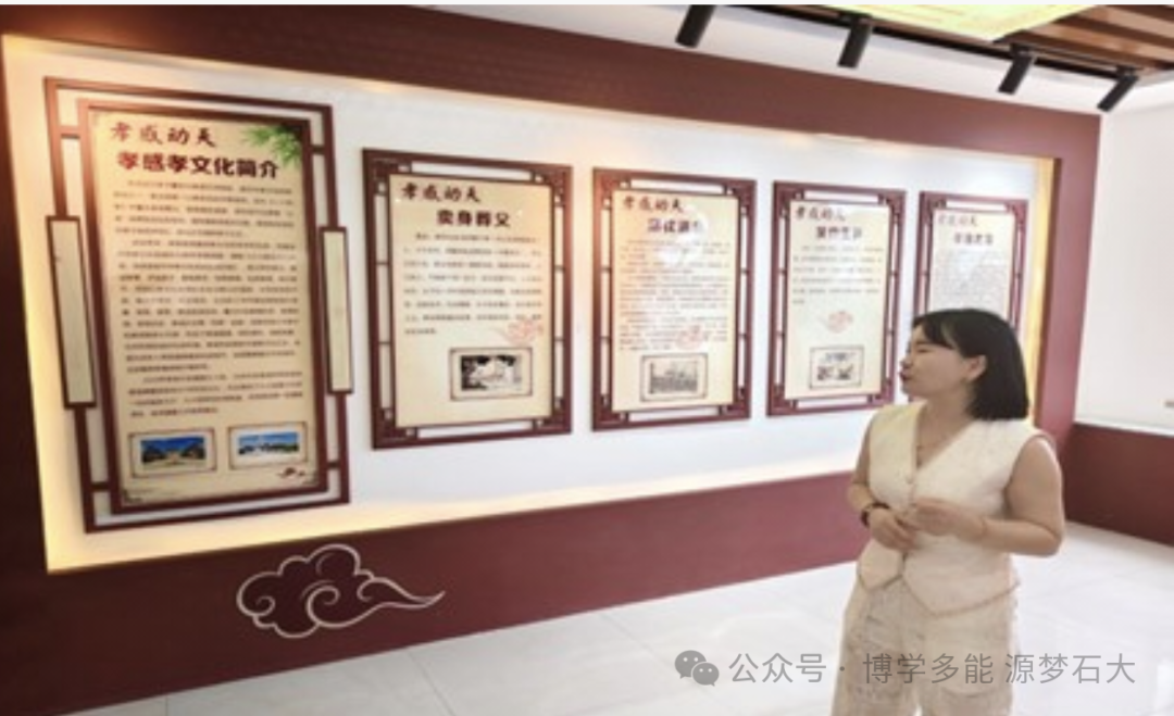在湖北孝感市对口援建的二十四孝陈列馆,实践团成员们了解到“孝感” 地名的由来 —— 因东汉孝子董永 “卖身葬父”的故事而得名。工作人员详细讲述了湖北孝感与九〇团的援建历史:多年来,孝感市在人才、技术、资金等方面持续支援九〇团,两地在经济协作、文化交流中结下深厚情谊,而二十四孝陈列馆正是这种“对口支援、互助共赢” 精神的生动载体,既传承了中华传统美德,也见证了跨地域协作的温暖。