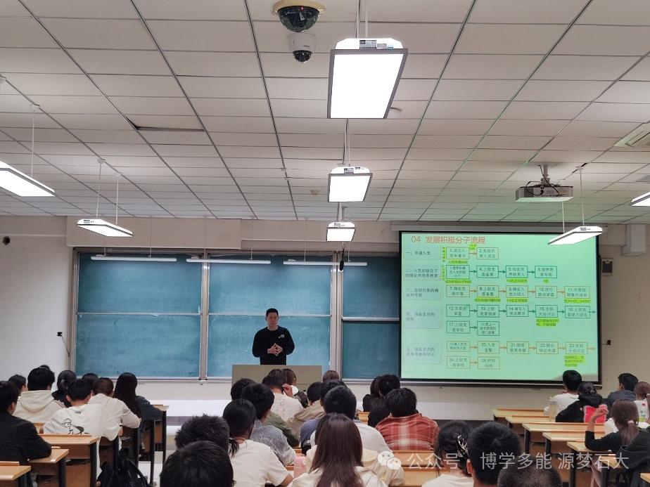 为加强新生思想政治引领作用、筑牢理想信念根基、引导广大新生积极向党、团组织靠拢,9月29日晚,能源与材料学院学生党支部面向2025级本科生举办入党流程宣讲会。宣讲会设两个会场,分别由支部党员邵纪鑫和杨逢春主讲。
