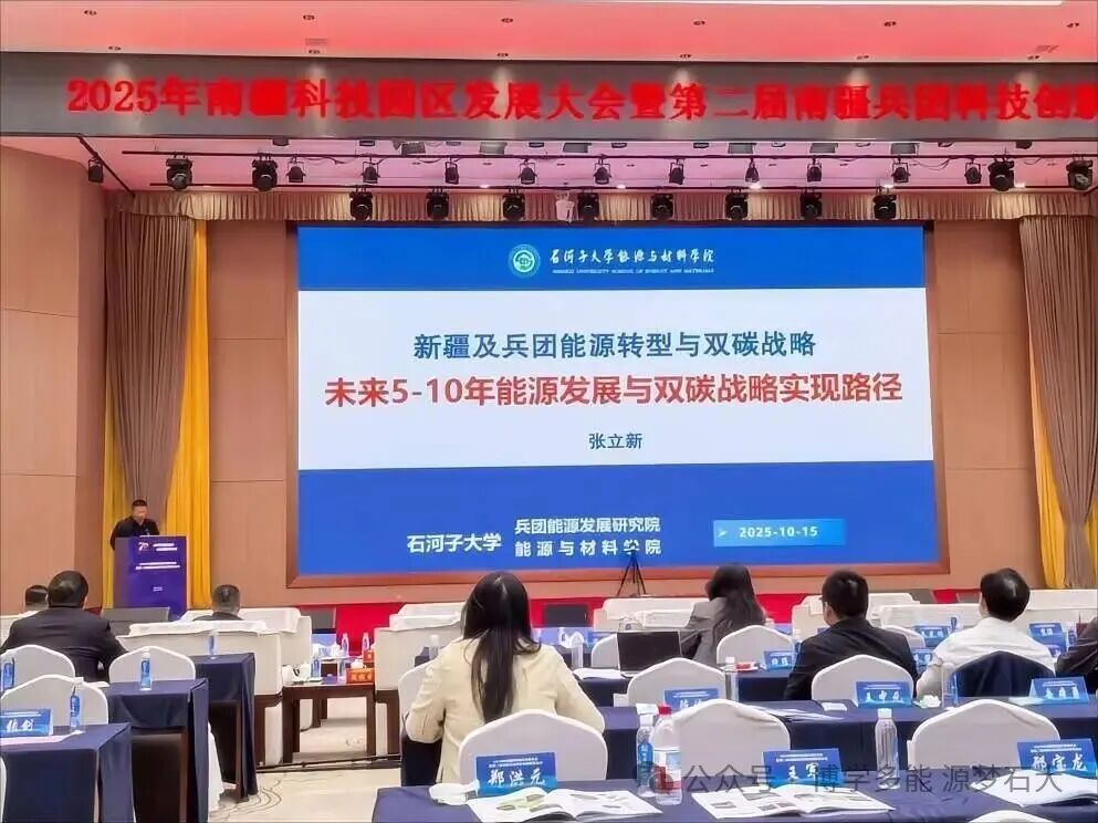 2025年10月15日,由新疆生产建设兵团科学技术局指导,第一师阿拉尔市人民政府、第三师图木舒克市人民政府、塔里木大学、浙江省援疆指挥部等单位联合主办的“2025年南疆科技园区发展大会暨第二届南疆兵团科技创新联盟会议”在新疆阿拉尔市塔河花园酒店隆重召开。石河子大学能源与材料学院党委副书记、院长,兵团能源发展研究院院长张立新教授受邀出席,并在大会上作《新疆及兵团能源转型与双碳战略——未来5-10年能源发展与双碳战略实现路径》专题报告。