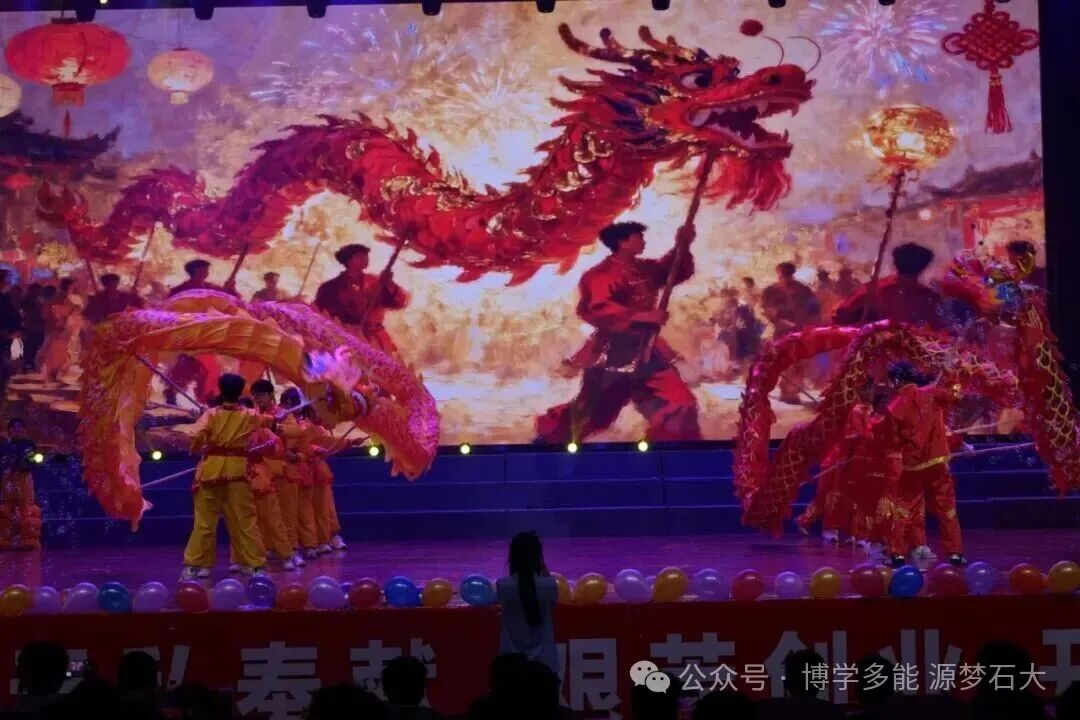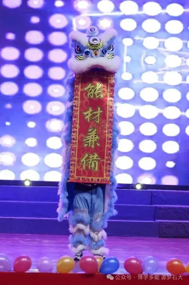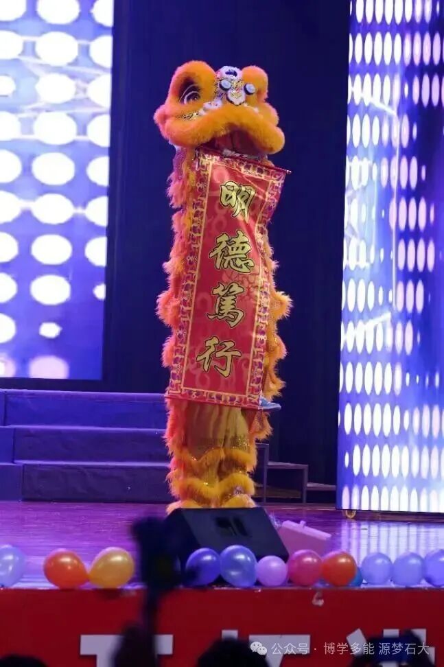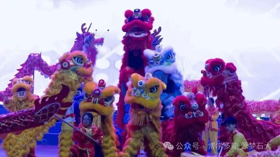 金鳞狂舞,雄狮腾跃!鼓点震彻全场,青云民体社的《龙狮共舞·武耀山河》以高难度动作演绎“中华魂”,最后定格的“明德笃行能材兼备”字样,点燃全场最大声浪的欢呼!