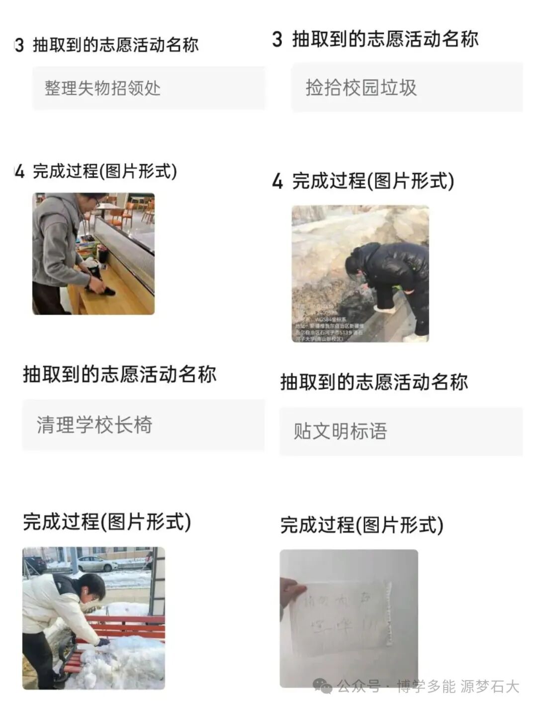 “线下践善行,线上晒成果”,本次活动的线上认证环节,成为展现志愿力量的重要窗口。完成任务后,同学们纷纷通过拍照、文字记录等方式,定格下自己的善举瞬间。