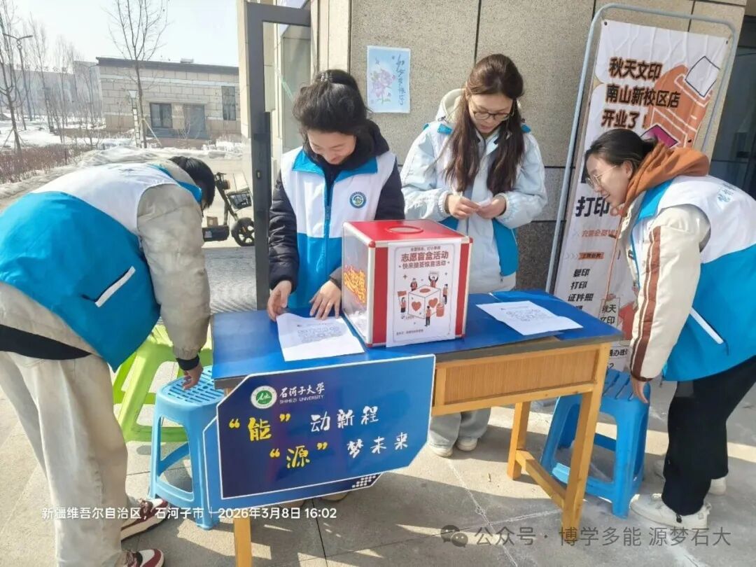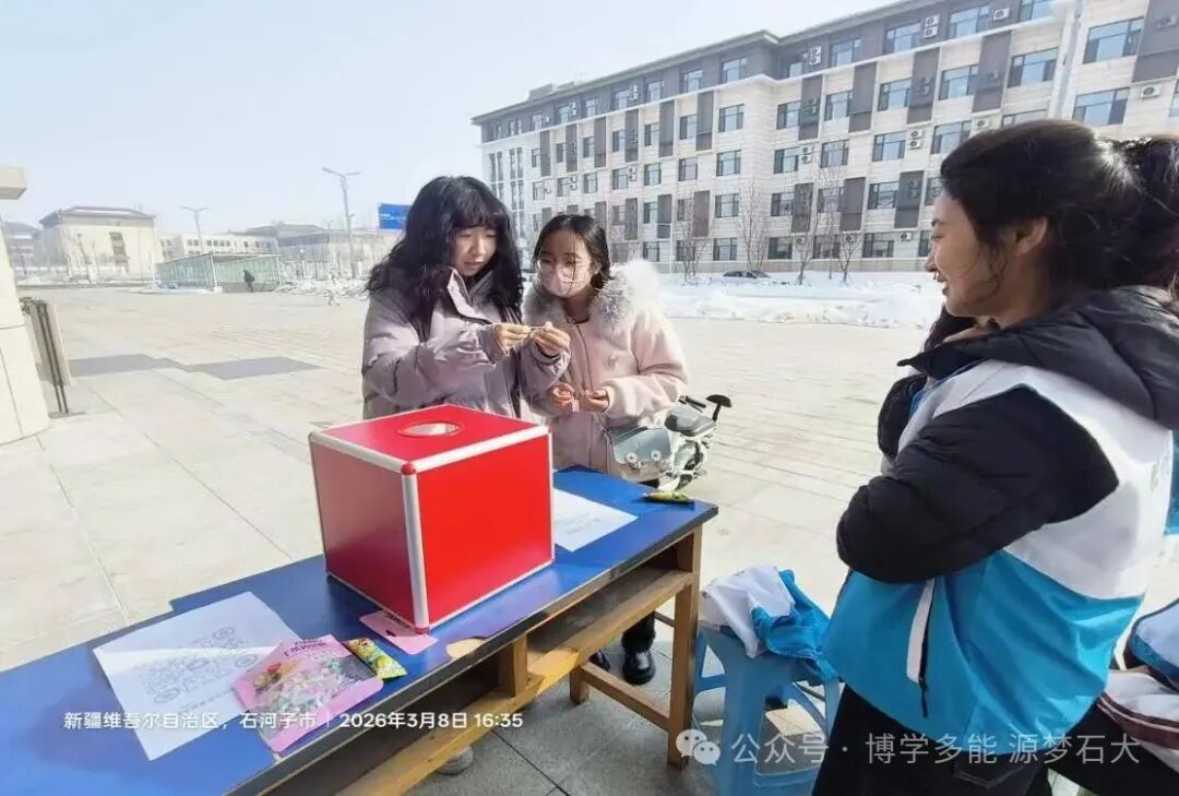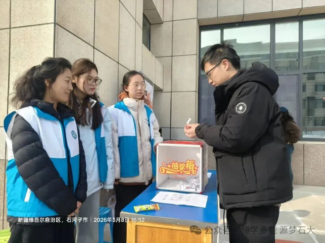 3月8日活动现场,氛围热烈而有序。同学们纷纷驻足,在抽取区抽取随机志愿活动,开启属于自己的“志愿惊喜”。