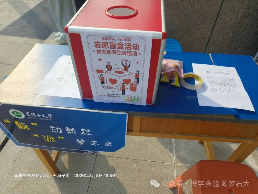 为深入弘扬新时代雷锋精神,创新志愿服务形式,3月8日,能源与材料学院联合红烛青年志愿者协会于将军山餐厅旁开展“承雷锋志,行小事善”雷锋月主题志愿盲盒活动。活动以“线下抽取任务、线上提交结果”的新颖模式,吸引众多同学踊跃参与,让青年学子在趣味实践中传递善意,以点滴行动践行雷锋精神。