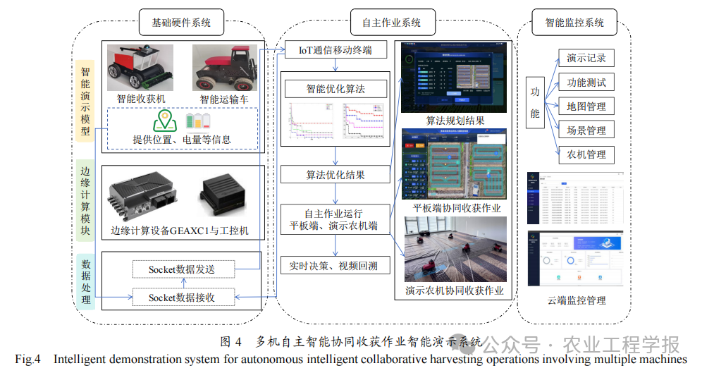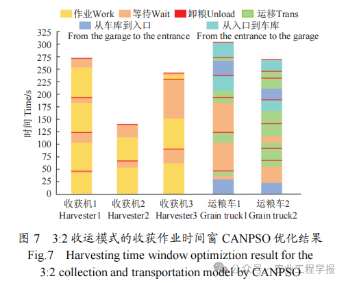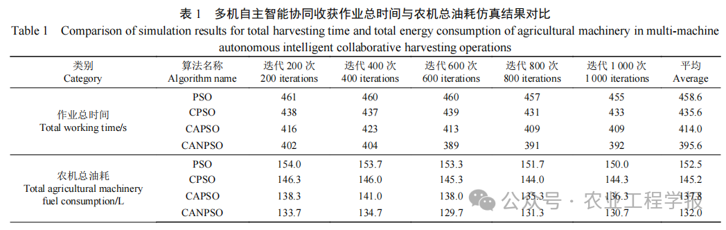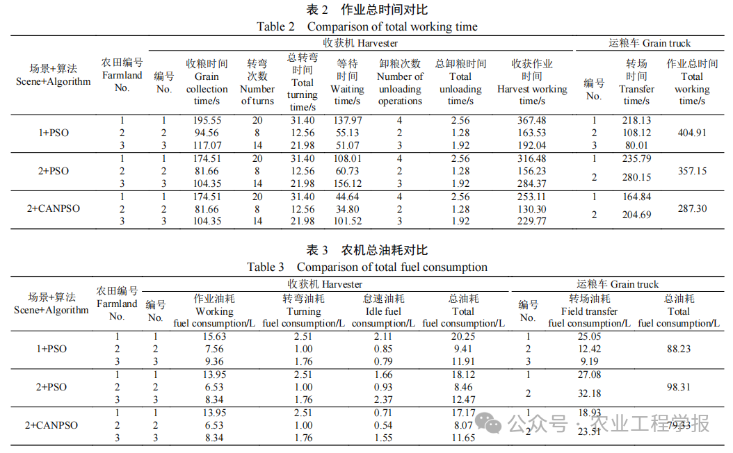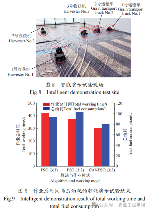 智能演示农机现场试验结果表明:相比于传统的单地块分配单台收获机和单台运粮车的收运模式,异类型多机自主智能协同小麦收获作业任务规划方法实现了多地块3台小麦收获机和2台运粮车的自主智能协同作业,作业总时间减少了29.05%,农机总油耗减少了13.16%,同时减少了运输资源浪费;相比于传统粒子群算法优化的多机自主智能协同收获作业任务规划方法,混沌自适应非线性粒子群算法优化的多机自主智能协同收获作业任务规划方法有效减少了小麦收获环节的作业总时间和农机总油耗,作业总时间减少了19.56%,农机总油耗减少了21.50%。