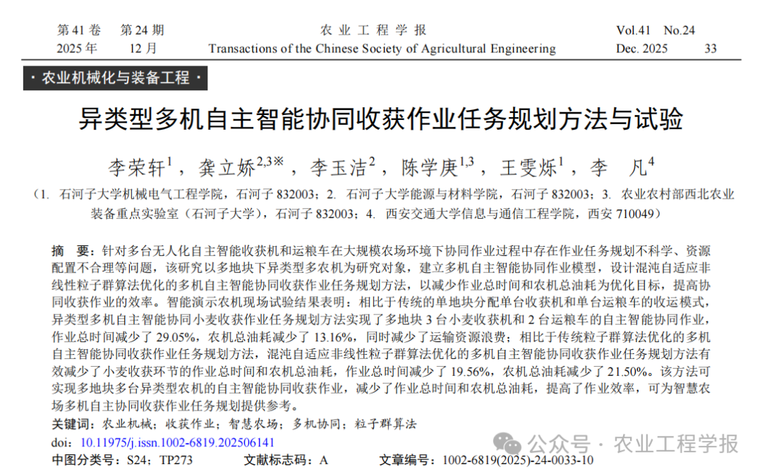 《农业工程学报》2025年第41卷第24期刊载了石河子大学等单位李荣轩、龚立娇、李玉洁、陈学庚、王雯烁与李凡的论文——“异类型多机自主智能协同收获作业任务规划方法与试验”。该研究由新一代人工智能国家科技重大专项(项目号:2022ZD0115803)资助。