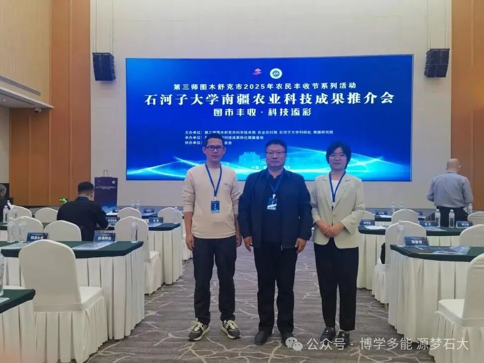 为深入推动农业科技创新与成果转化,服务南疆地区乡村振兴战略,9月24日,“图市丰收・科技添彩——石河子大学南疆农业科技成果推介会”在第三师图木舒克市文体活动中心南门三楼多功能会议厅召开。本次会议由第三师图木舒克市科学技术局、农业农村局、石河子大学科学研究处、南疆研究院主办,石河子大学科技成果转化南疆基地承办,新疆博士联合会、新疆锦囊科技服务有限公司协办,以“聚焦农业科技创新,助力乡村振兴发展”为主题,汇聚政府、高校、企业多方力量,旨在搭建产学研用深度融合的交流平台。我院院长张立新、胡雪老师、张肖阳老师受邀参会,并在会上作农业科技成果推介。